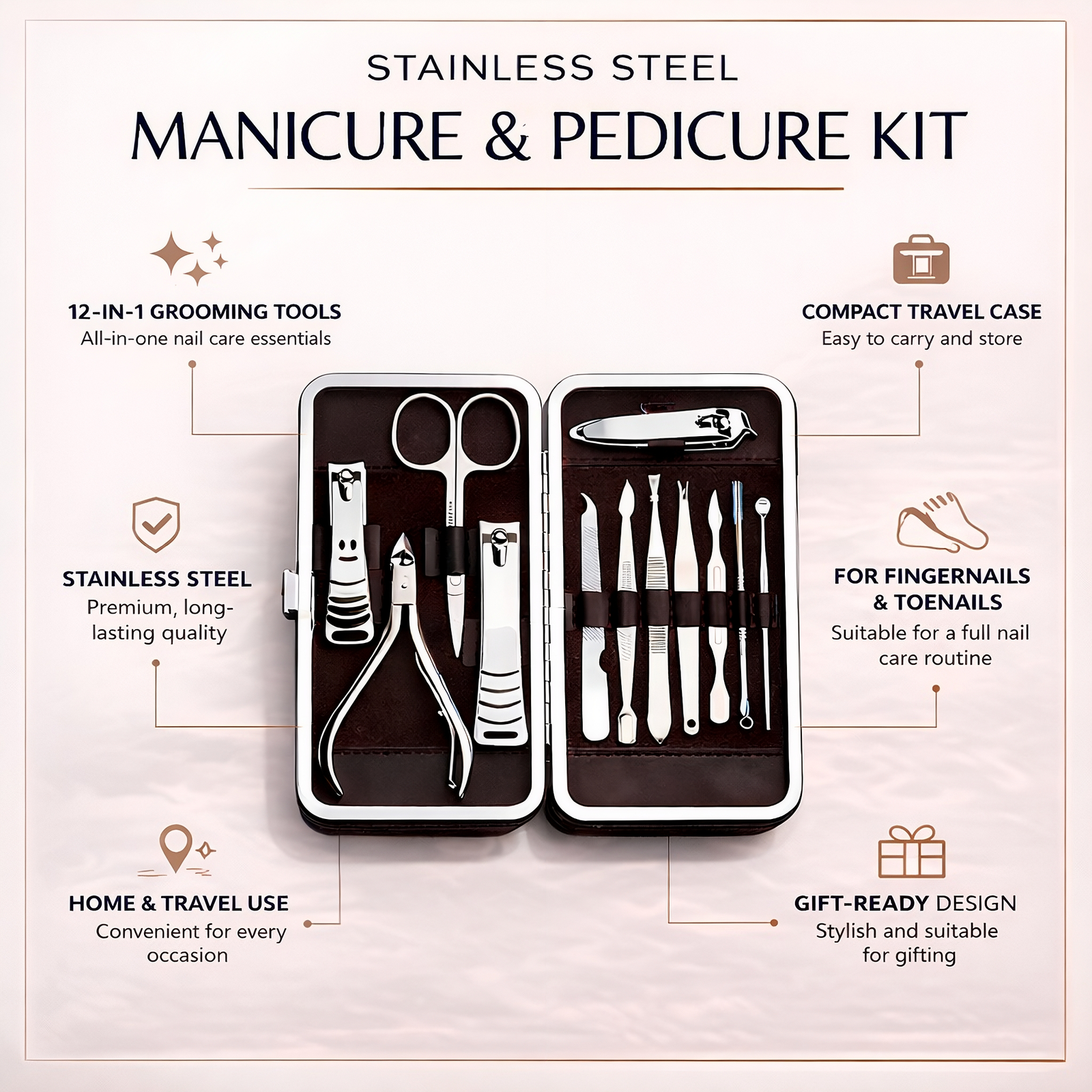 For the little details that make everything feel more put together, this set is made to help you trim, shape, and tidy with ease. Each tool is made for controlled touch-ups, so keeping nails, cuticles, and brows neat feels simple and satisfying.